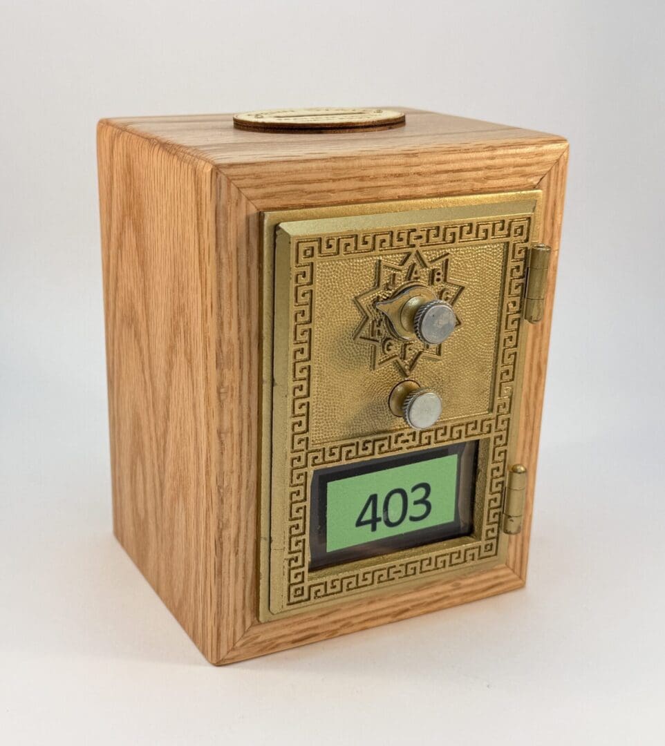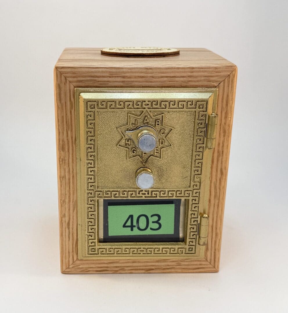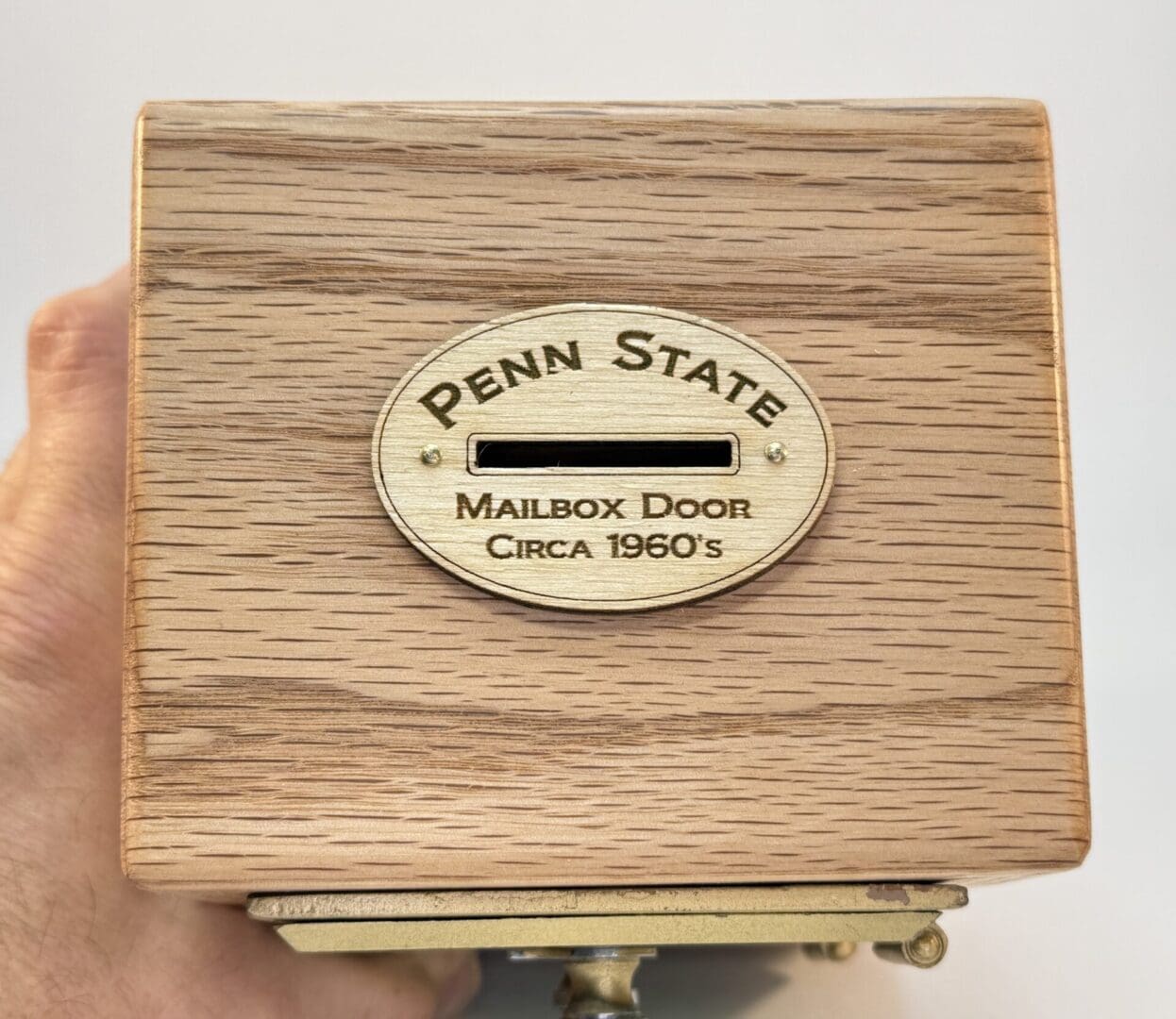 Penn State Mailbox Door Bank # 403. The door was made in the 1960’s and has the date stamped on the inside. It spent many years in daily service at Findlay Commons, Penn State University and was retired in the spring of 2023. Findlay Commons is located in the East Halls Residence Area. Doors were purchased from Lion Surplus in September of 2023. Box is Hand Crafted from Salvaged Red Oak with a natural Oil and Wax finish. The box is cut so the grain wraps around the outside. There are felt pads on the bottom, and Penn State Mailbox Door coin slot on top. The lock is fully functional, and the combination is provided.  This Penn State Mailbox Door Bank is an excellent piece of Penn State History and a would be a great addition to any PSU collection.
