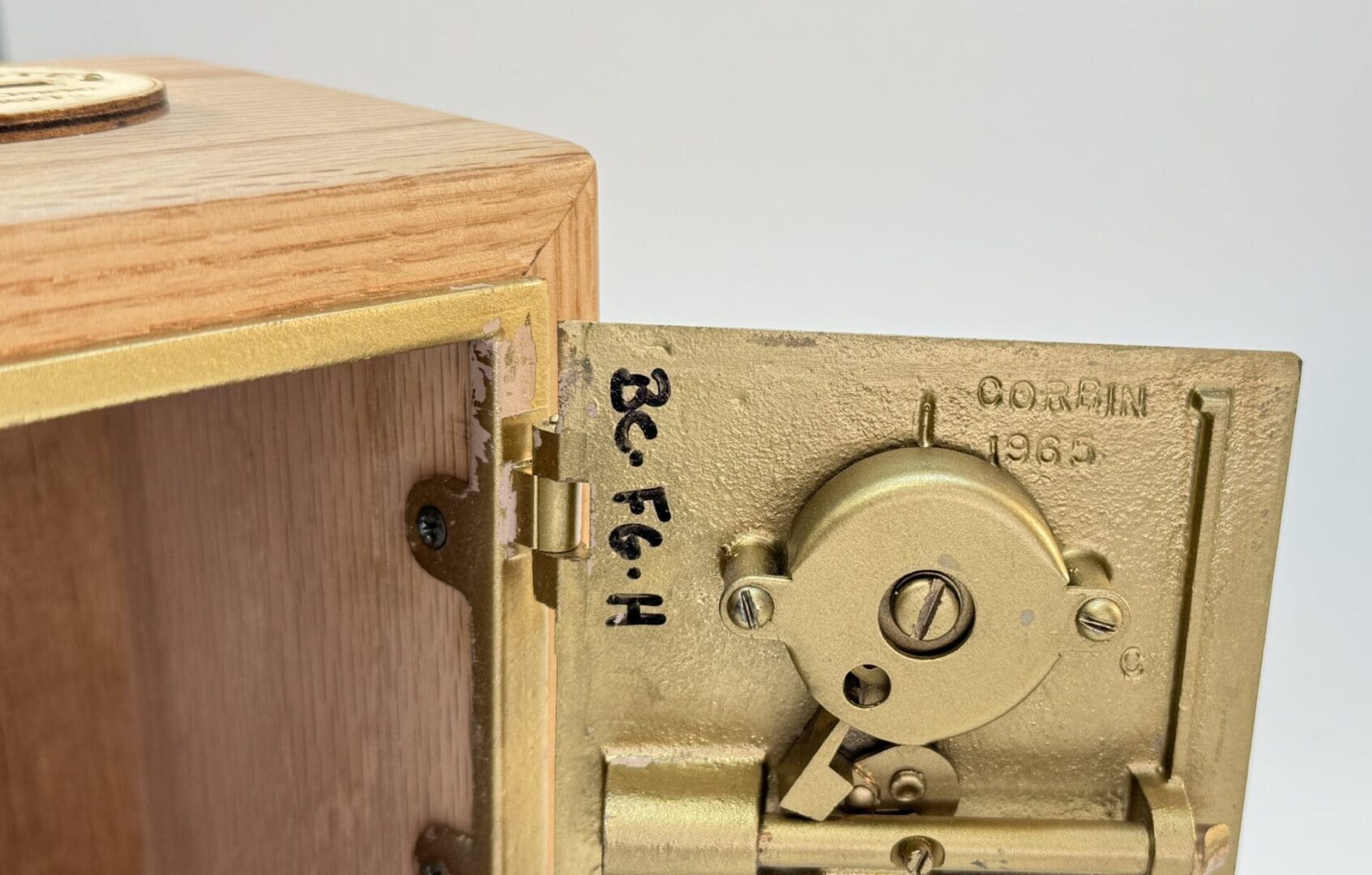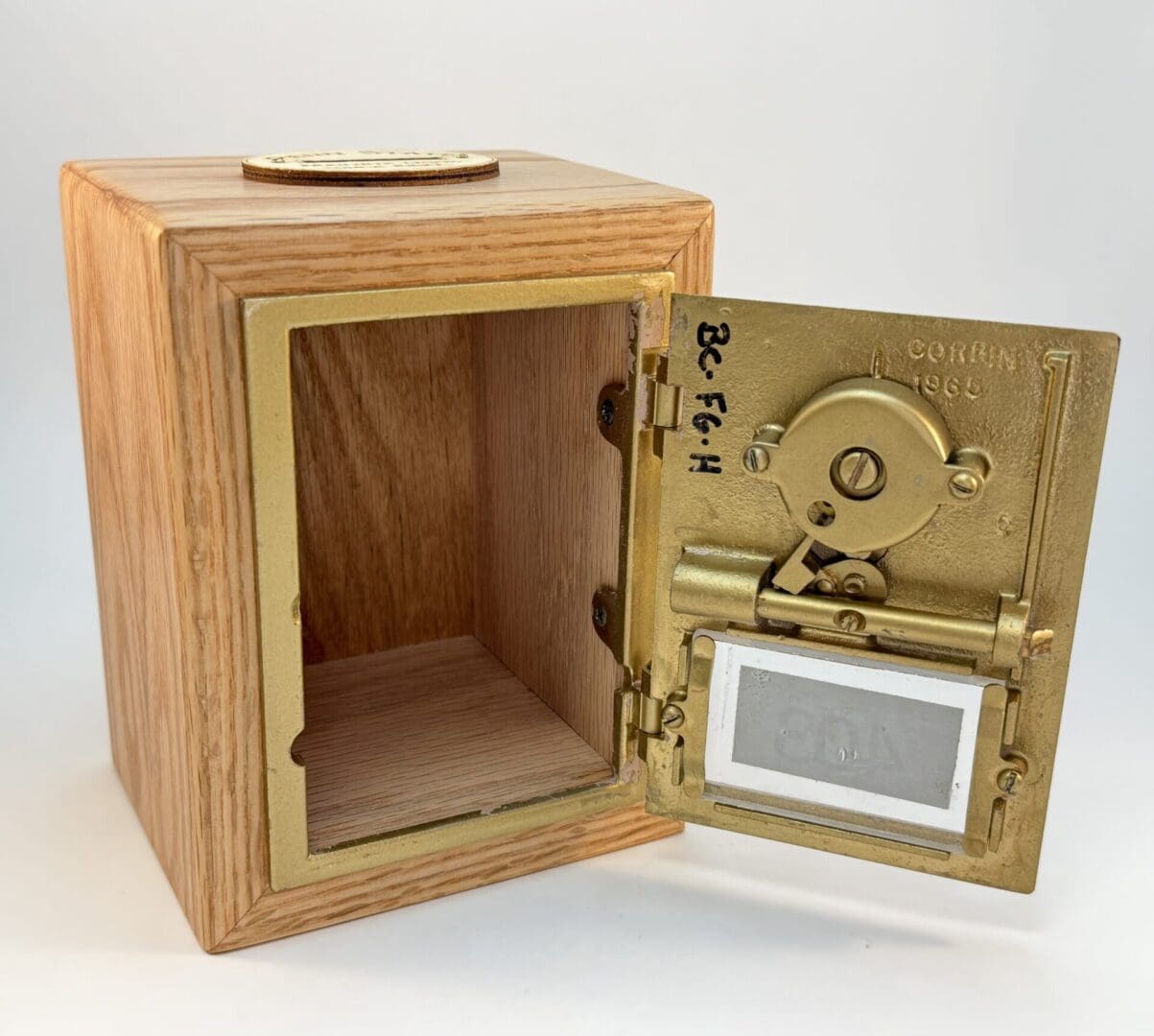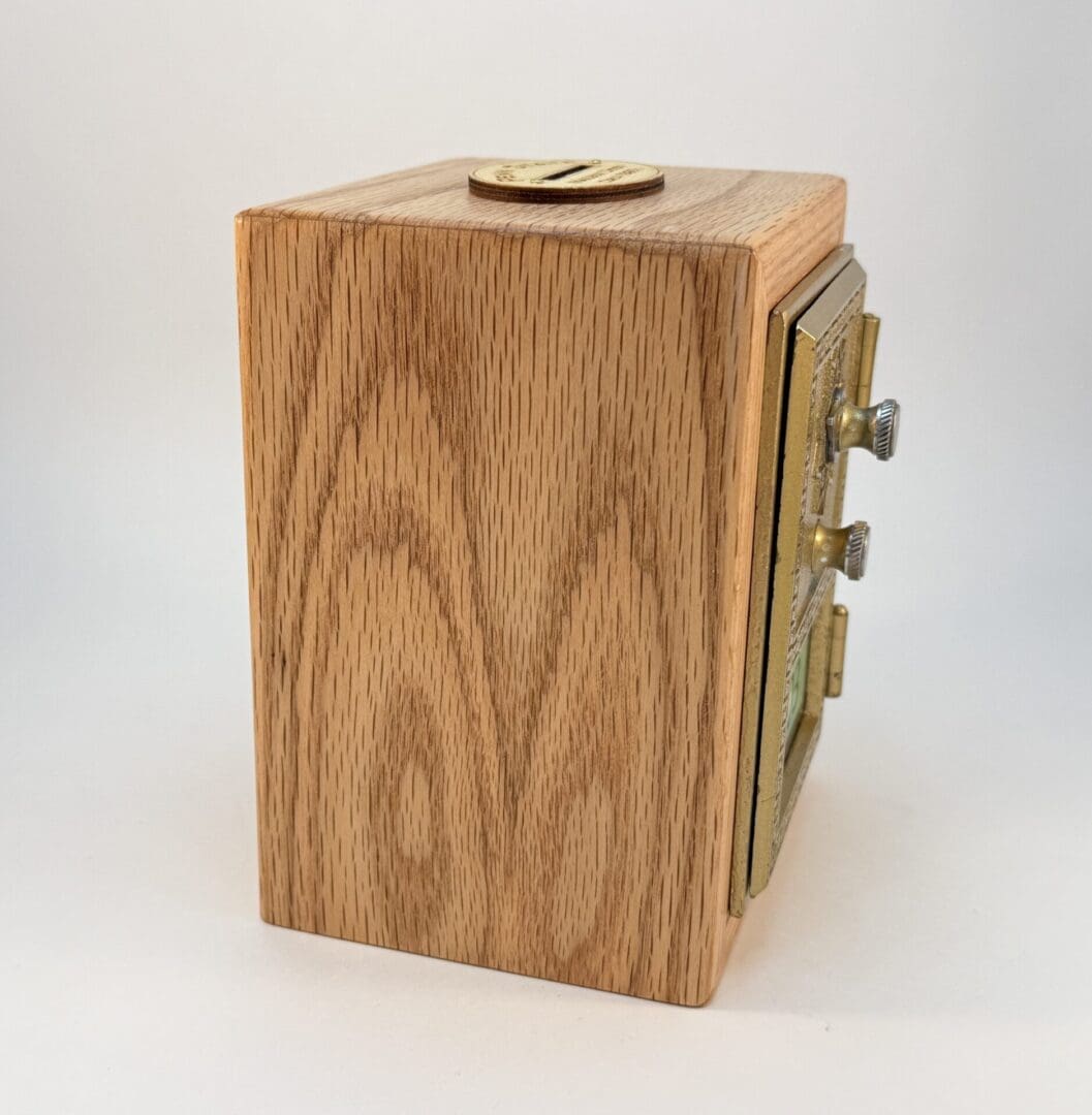 Penn State Mailbox Door Bank # 403. The door was made in the 1960’s and has the date stamped on the inside. It spent many years in daily service at Findlay Commons, Penn State University and was retired in the spring of 2023. Findlay Commons is located in the East Halls Residence Area. Doors were purchased from Lion Surplus in September of 2023. Box is Hand Crafted from Salvaged Red Oak with a natural Oil and Wax finish. The box is cut so the grain wraps around the outside. There are felt pads on the bottom, and Penn State Mailbox Door coin slot on top. The lock is fully functional, and the combination is provided.  This Penn State Mailbox Door Bank is an excellent piece of Penn State History and a would be a great addition to any PSU collection.